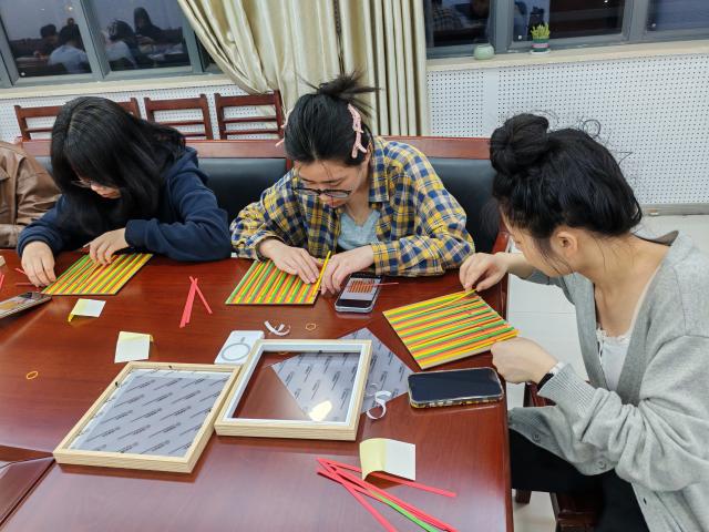 陈艳为在座同学们详细解读了二十四节气的起源、深刻内涵,以及竹编技艺的悠久历史和基本技巧。在老师的指导下,大家手持竹条,全神贯注地投入竹编画的创作之中,同学们互相交流创作心得,分享编织技巧。
